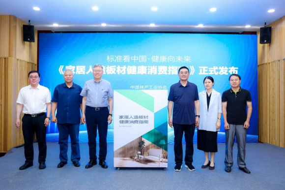 中国林产工业协会会长周鸿升,全国人大代表、中国环保产业协会副会长、万华生态集团董事长郭兴田,中国工程设计大师、中国林产工业协会首席专家肖小兵,中国消费者报消费研究四部主任谭笑,国家林草局产业发展规划院教授级高工张忠涛,国家人造板与木竹制品质量检验检测中心主任、教授级高工付跃进共同发布《家居人造板材健康消费指南》(以下简称《指南》)。